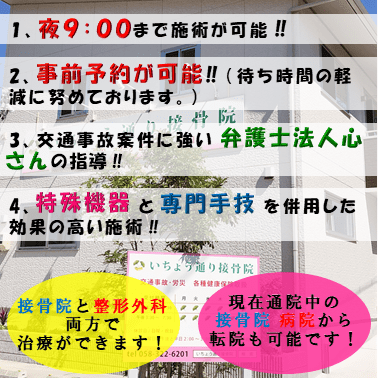 各務原のいちょう通り接骨院は,開業してから現在に至るまで各務原や各務原近郊の非常に多くのむちうちに悩む被害者の方を施術し効果を実感して頂いております。