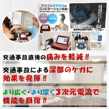 各務原のいちょう通り接骨院でのむちうち施術はこの深部の組織にアプローチが可能な「 特殊医療機器とむち打ち専門手技とを併用 」して行うものでこの組み合わせは相性が良く施術を受けられた皆様にはより高い施術効果を実感して頂いております。